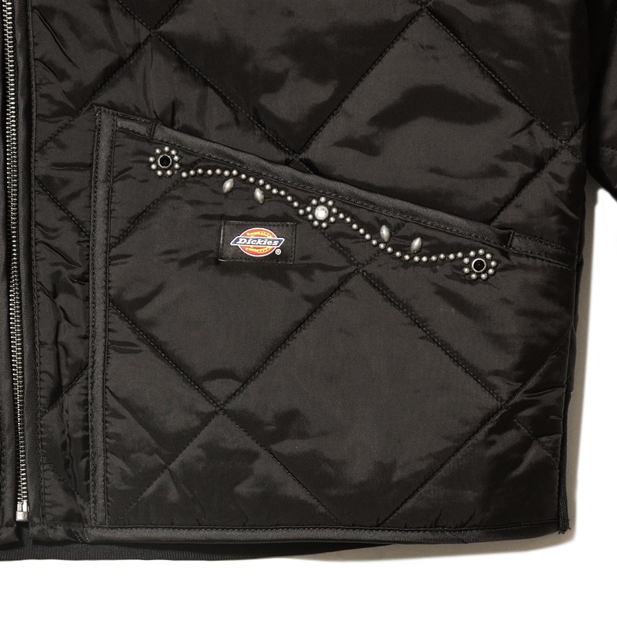 US企画のDickiesダイヤモンドキルトジャケットに、フラワーモチーフのスタッズワークを施しています。
