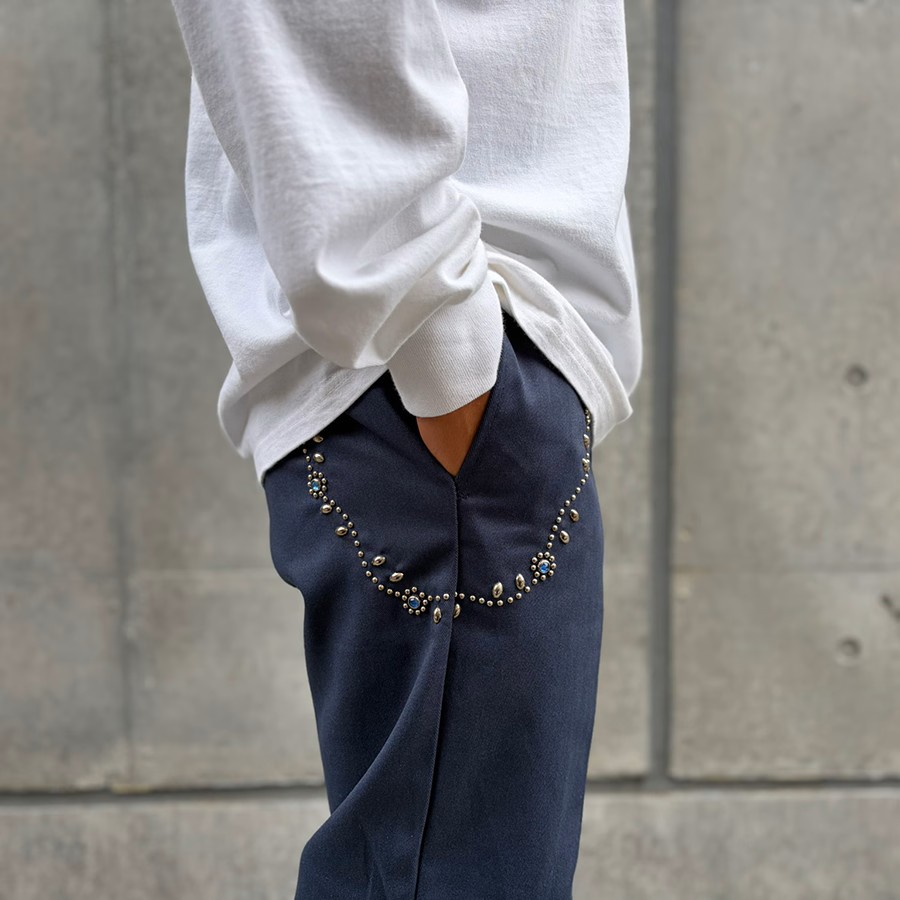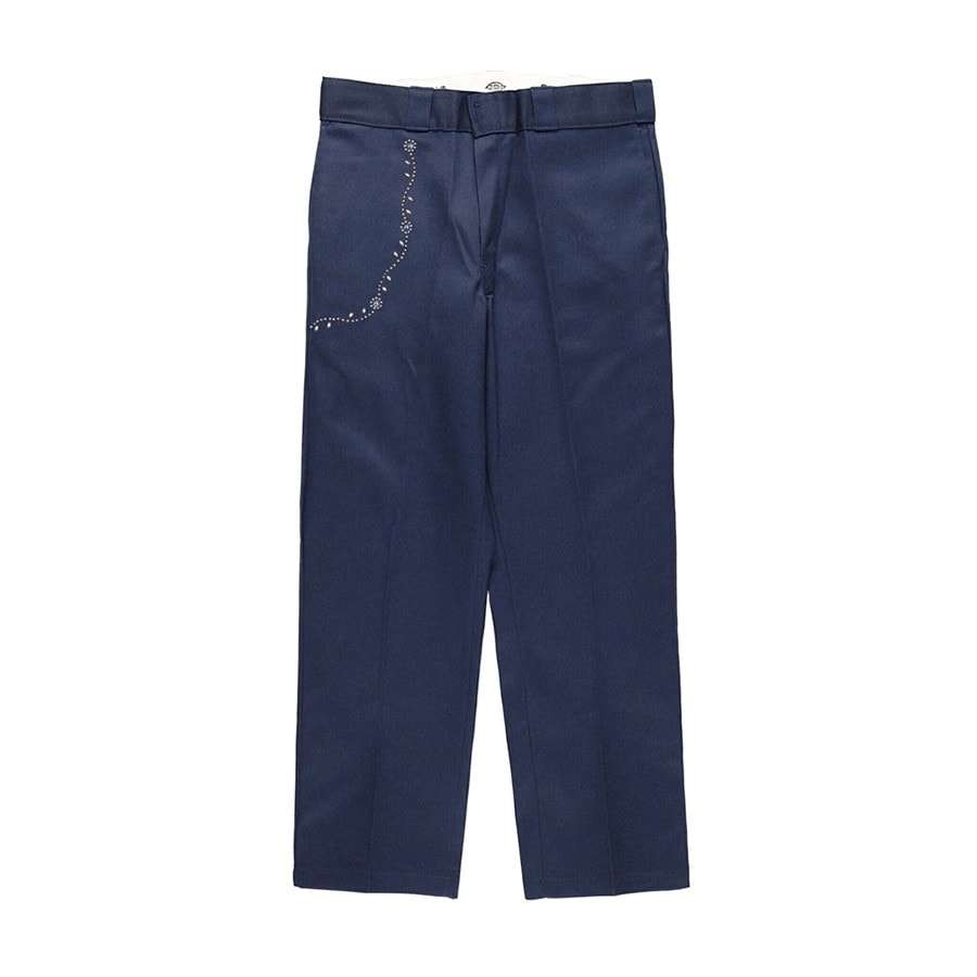 Dickiesの定番「874」にスタッズワークは人気のフラワーモチーフをウォレットチェーンのようにデザインしています。