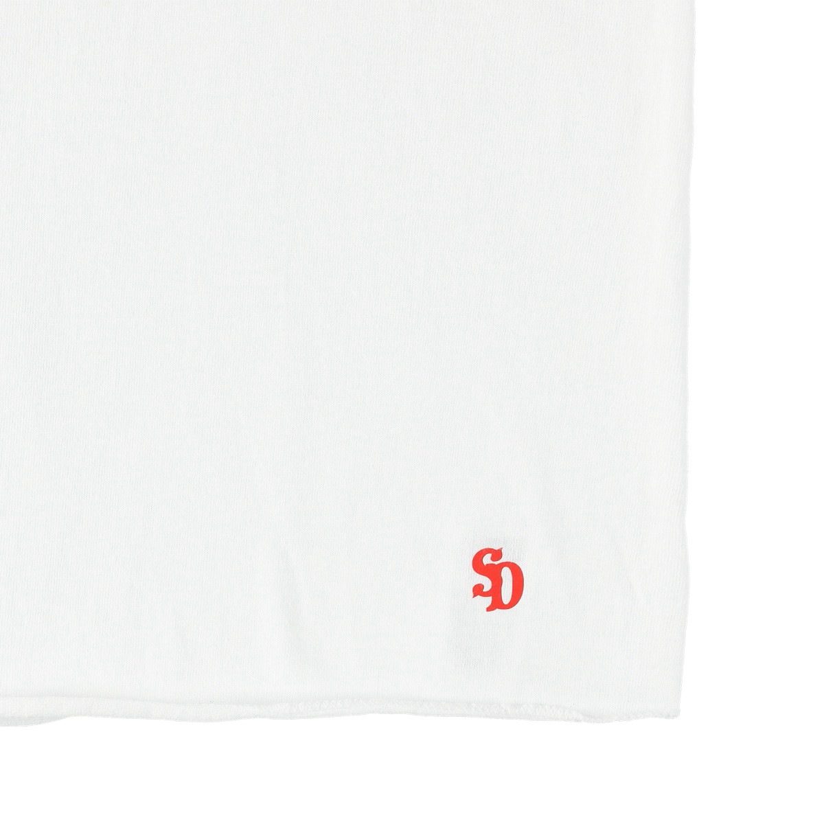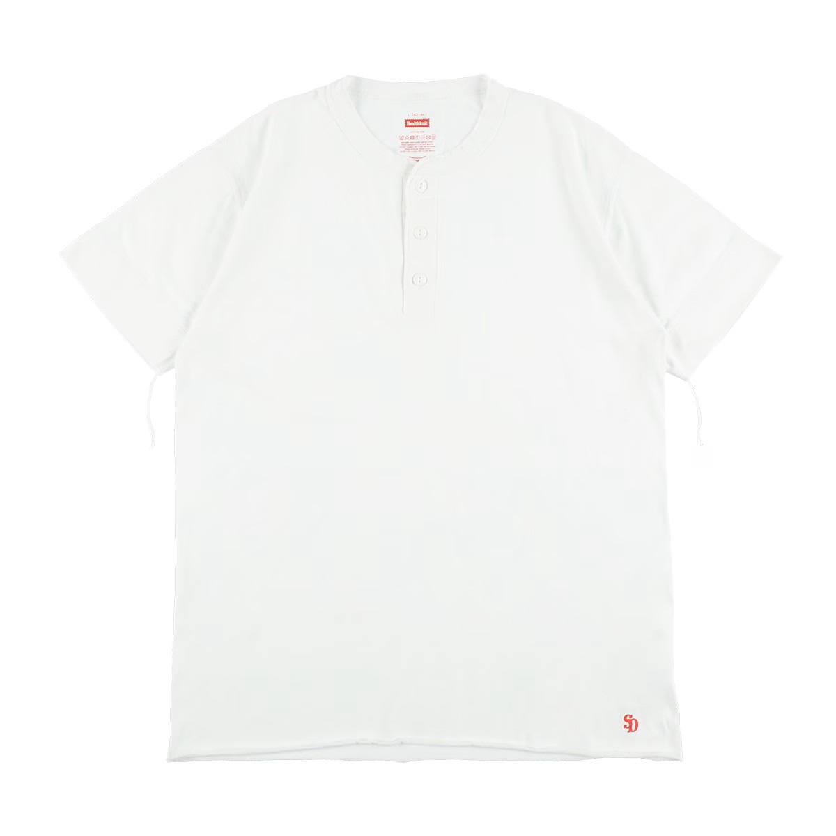 ネームプリント、左裾にロゴプリントを施した、クラシックな風合いが魅力のヘンリーネックTシャツに仕上げました。